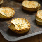 - Place the potato slices on the prepared baking sheet, making stacks of 5-6 similarly sized slices and sprinkling a pinch of parmesan between each layer. Sprinkle the tops of the stacks with the remaining 2 tbsp parmesan.