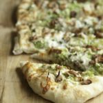 - Stretch the pizza dough into a 16” round (or just stretch it into an amoeba shape like I do… whatever floats your boat.). Brush the olive oil onto the dough, and sprinkle with minced garlic. Sprinkle half of the mozzarella onto the crust, then top with the brussels sprout mixture, bacon bits, and then sprinkle with the remaining mozzarella and parmesan cheese.