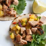 - To assemble the tacos, arrange the tortillas on four serving plates. Spoon chopped pork onto the tortillas, dividing evenly, and then top each one with a generous amount of pineapple salsa.