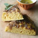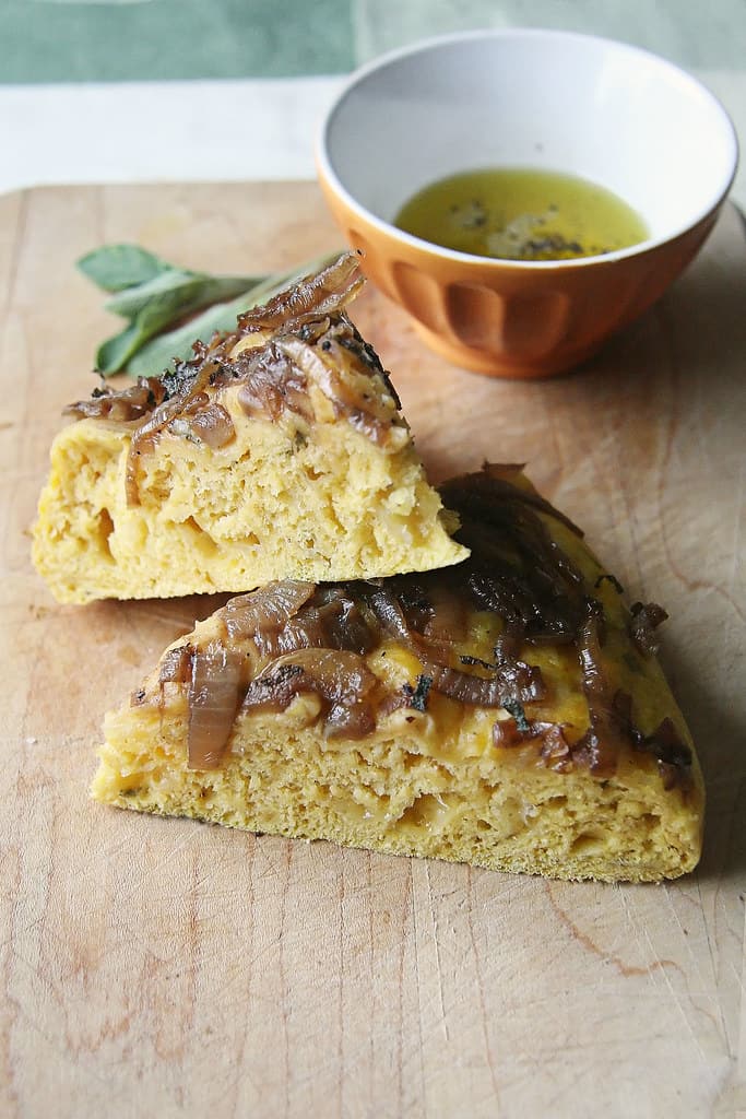- Preheat oven to 425F. Using your fingers, make several dimples into the top of each loaf. Brush with a little olive oil, then spoon the onion mixture onto the tops of the loaves. Finish with a sprinkling of coarsely chopped fresh sage, if desired.
