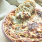 - Scrape the mixture into the prepared baking dish, and smooth out into an even layer. Bake in preheated oven for 25-30 minutes, or until the top is browned and the dip is hot and bubbly. Serve immediately with thinly sliced baguette or crackers for dipping.